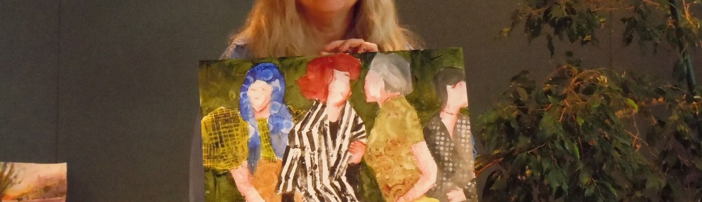 For the composition, I used one I had previously invented for the collage “Chit Chat.” It’s a primarily gestural drawing of four women. I used handmade stamps to add texture to the painting, made out of cut foam and eraser material. Also another stencil in a different pattern.