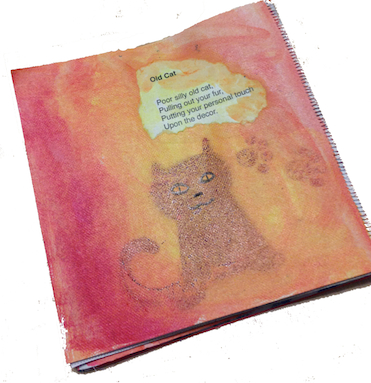 I have several pieces in the exhibit – one is a “meandering book’ with cat images and a poem “Old Cat” I wrote about my cat Flora. It’s done on squares of canvas paper sewn together in a pattern that allows the book to be folded into a square.