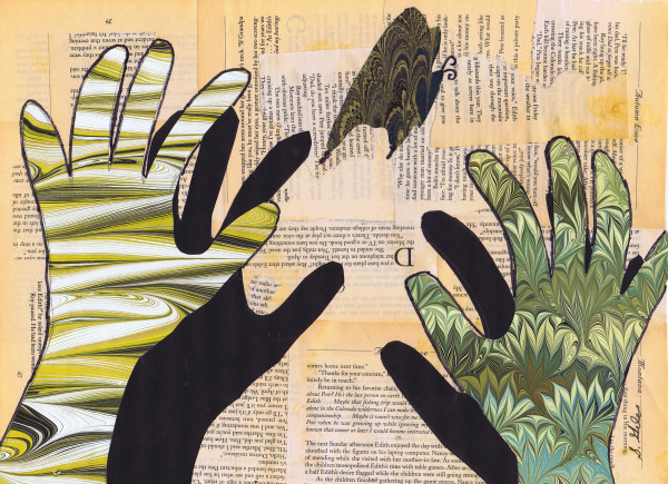 The last project that I’m exhibiting is one where we traced our hands and created art projects from the mask. Here is one of the pieces I created (using old book paper, black construction paper and hand marbled paper that I had purchased.)