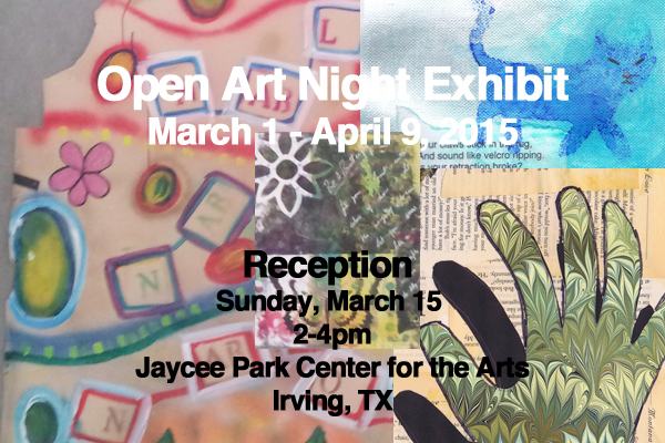 Our Open Art Night group at the Irving Art Association (IAA) meets two Friday evenings a month at the Jaycee Park Center for the Arts in Irving. It’s free and we work on group projects – either artsy or craftsy. Volunteers lead the group and we have accumulated a lot of finished work, so we decided to hold an exhibit. No fees, no prizes, just for fun. For more about the exhibit, see http://irvingartassociation.org/2015/03/open-art-night-exhibit-reception-march-15/