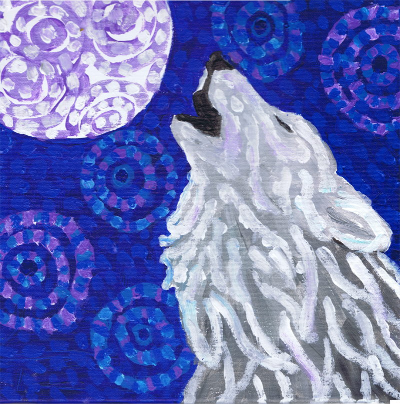 I did two different versions of a wolf howing at the moon – one with metallics and iridescents. Plus a roadrunner that morphed into a totally imaginary bird. The works are done in acrylic and some of them have dots added using dimensional paint (puff paints.)