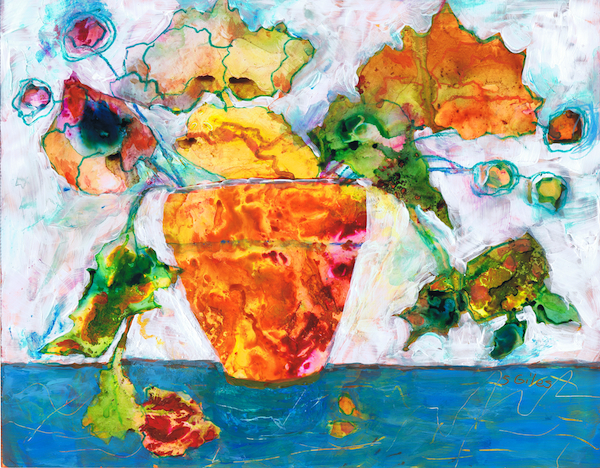 Some of the media I’m using: acrylic inks and Golden High Flow acrylics, alcohol inks, acrylic pens, watercolor crayons, colored pencils, sharpies, white acrylic, white pens…