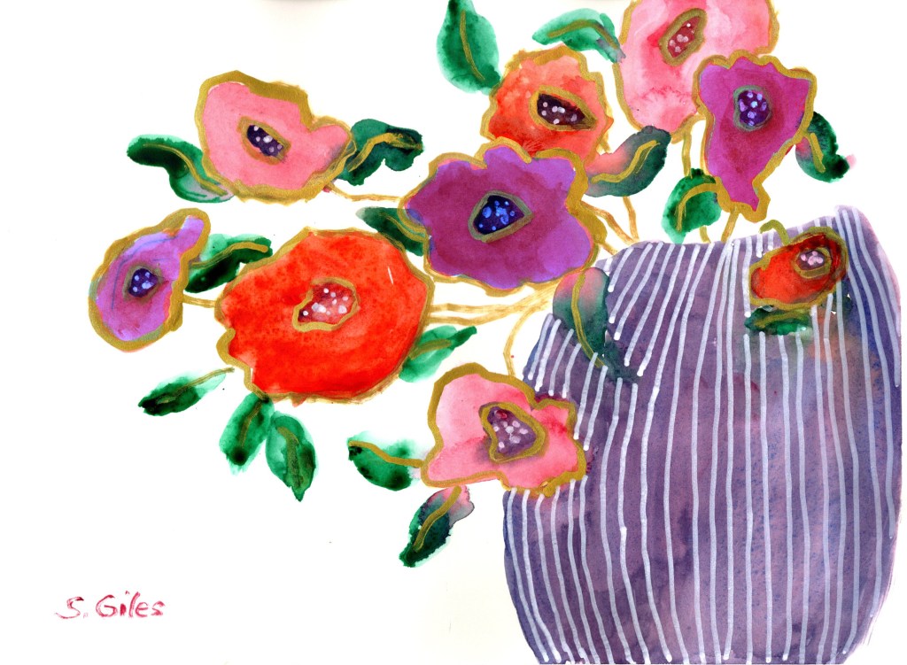 For our first foray into watercolor & pens, we tackled a simple vase of flowers in a vase. The design of the flowers is flat, but they are enhanced with lines made by Posca paint pens — gold lines around the flowers, and white lines on the vase, plus white dots in the floral centers.