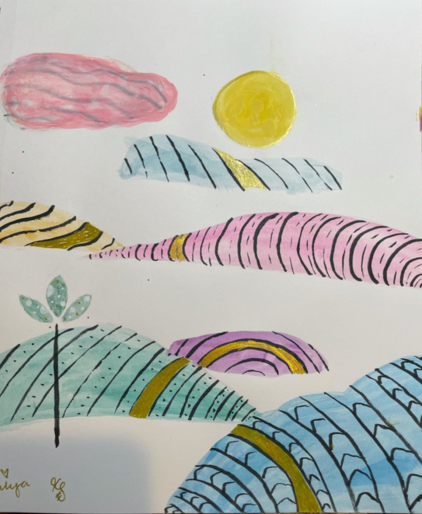 For our next art adventure, we did watercolor mountains with lines. Again just simple landforms with decorative striping and gold accents.