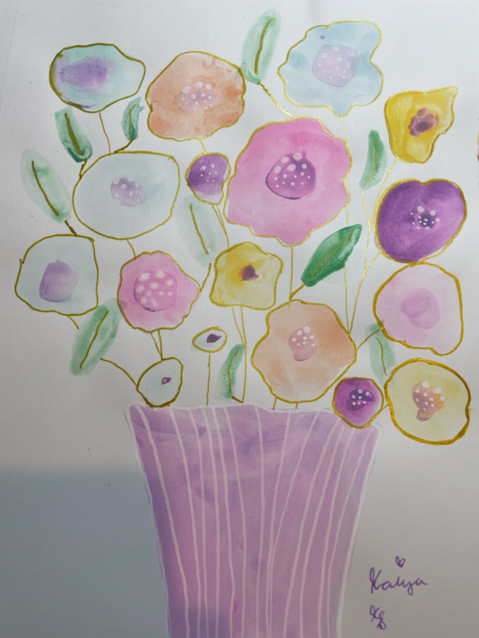 For our first foray into watercolor & pens, we tackled a simple vase of flowers in a vase. The design of the flowers is flat, but they are enhanced with lines made by Posca paint pens — gold lines around the flowers, and white lines on the vase, plus white dots in the floral centers.