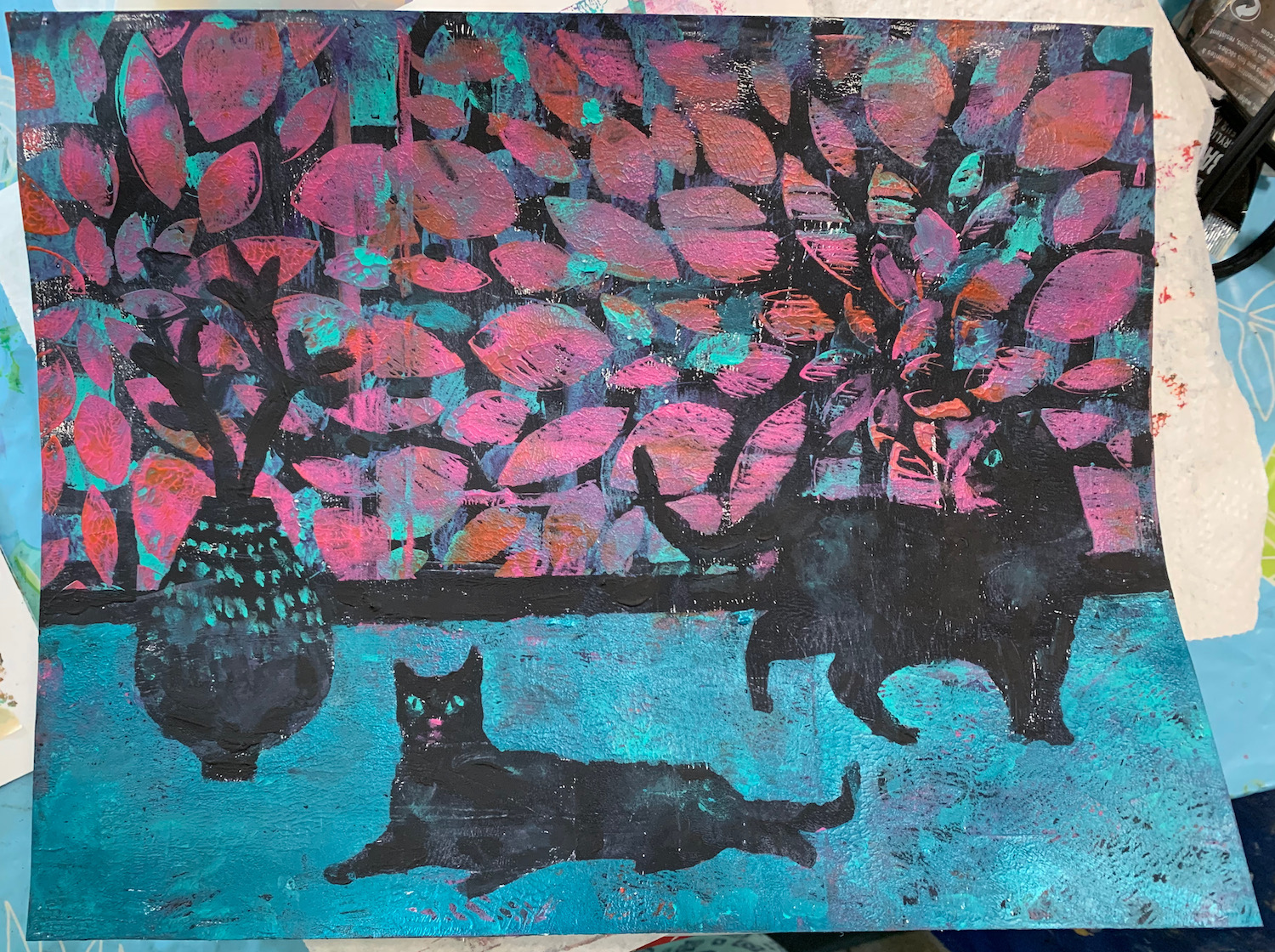 So I created several masks of the shapes of black cats and vases and sent the file to Kaiya’s mother. She printed them out so that Kaiya could use them also. We used these masks to create simple compositions of interiors. Basically the division between foreground and background was defined by using masking tape on the paper. The masks along with patterned stencils were created the scene via gelli printing. This method is related in concept to negative painting, since the first layer printed was solid black, which formed the basis for the black cats, vases and baseboards, as well as the background to everything else. Details like the cat eyes were added by brush.