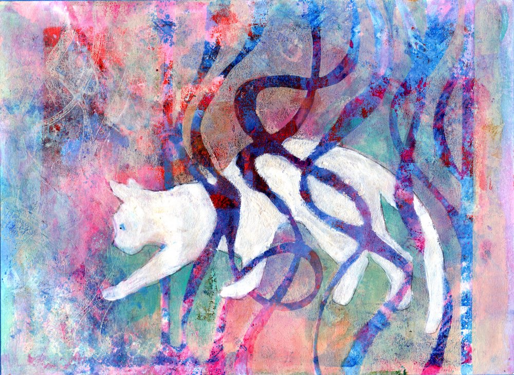 As illustrated in my last post, I created a black cat-based gelli print/painting in a Zoom session with my granddaughter Kaiya. This inspired me to continue on with my cat theme. Again I used cat-shaped masks along with stencils to create acrylic prints with my gelli plate. These were further enhanced by painting areas that needed further tweaking or development. All of these creations reflect my interest in luxuriant color, simple shapes and repeating patterns.